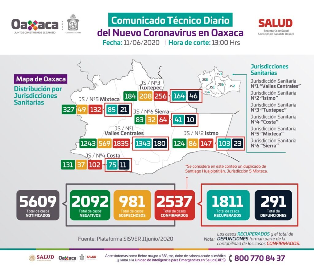 Oaxaca de Juárez, Oax. 11 de junio de 2020.- El titular de los Servicios de Salud de Oaxaca (SSO), Donato Casas Escamilla, informó que al corte epidemiológico de este jueves 11 de junio se han presentado 85 casos nuevos a COVID-19, que suman dos mil 536 casos confirmados acumulados.