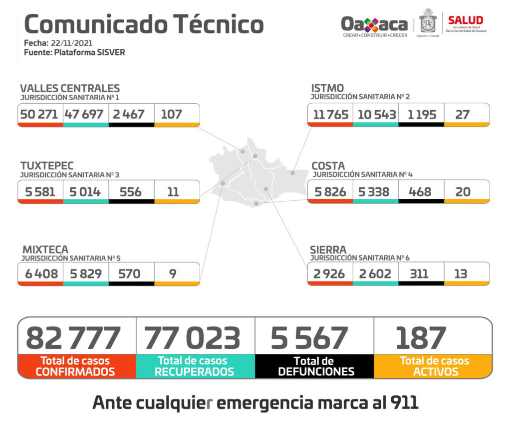 En relación al panorama jurisdiccional, Valles Centrales ocupa el primer lugar con 50 mil 271 casos confirmados y dos mil 467 defunciones, Istmo 11 mil 765 casos confirmados y mil 195 personas perdieron la vida, Mixteca registra seis mil 408 casos confirmados y 570 decesos, Costa cinco mil 826 casos confirmados y 468 defunciones, Tuxtepec cinco mil 581 casos confirmados y 556 decesos, Sierra dos mil 926 casos confirmados y 311 perdieron la vida.
