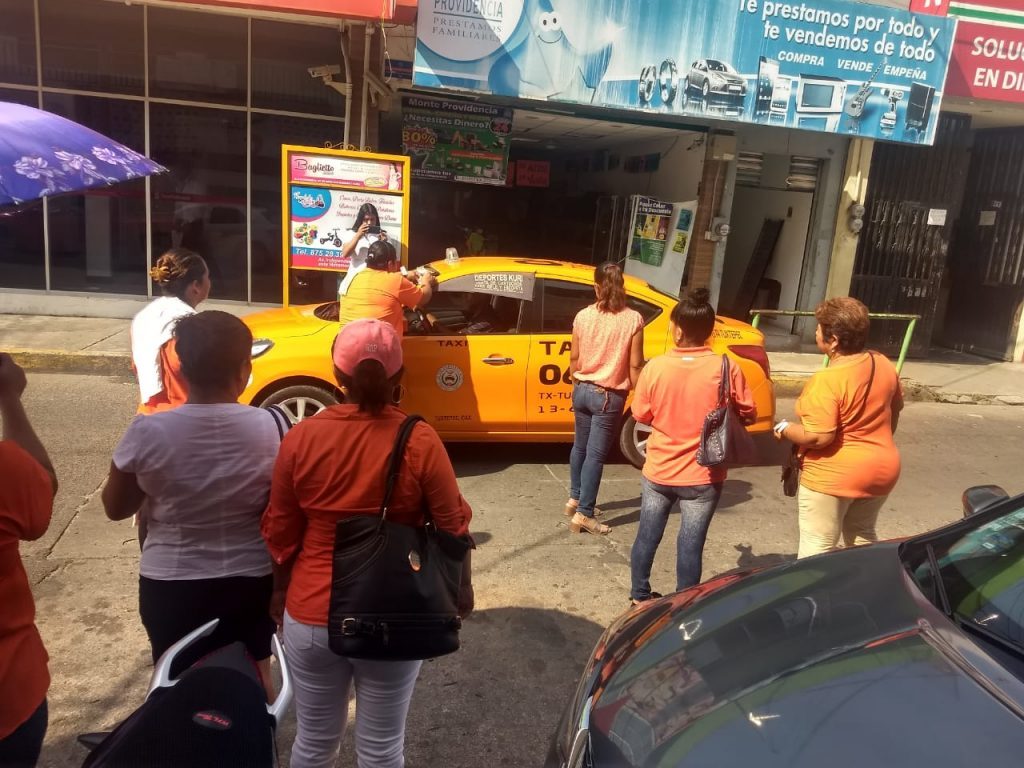 Tuxtepec, Oaxaca.- Como todos los días 25 de cada mes, el Instituto Municipal de la Mujer de Tuxtepec llevó a cabo actividades para promover la no violencia en contra de las mujeres, en esta ocasión encabezadas por la directora, Lissette Alegría Oseguera, un grupo de féminas llevó a cabo la pega de alcamonías en taxis, automóviles particulares y repartieron folletos en los que invitan a mantener la paz y la no violencia hacia las mujeres y las niñas.