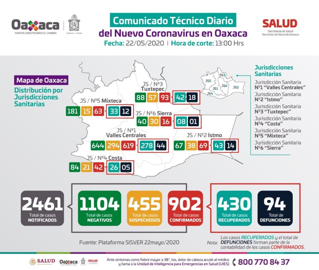 Oaxaca de Juárez, Oax. 22 de mayo de 2020.- La subdirectora general de Innovación y Calidad de los Servicios de Salud de Oaxaca (SSO), Rosa Lilia García Kavanagh, en representación del titular de la dependencia, Donato Casas Escamilla, informó que de acuerdo al comunicado técnico diario, este viernes 22 de mayo se han registrado 94 casos nuevos de COVID-19, con lo que suman 902.