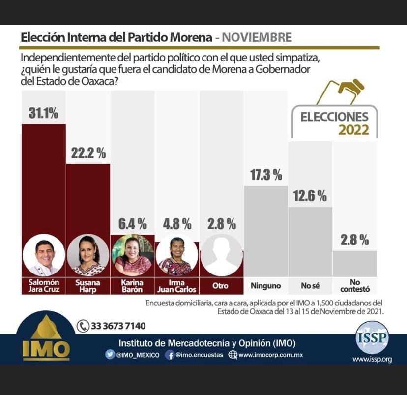 Oaxaca de Juárez.- En las encuestas serias, registradas y con datos públicos el Senador Salomón Jara, continúa con amplia ventaja frente al resto de aspirantes rumbo al 2022 para Oaxaca.