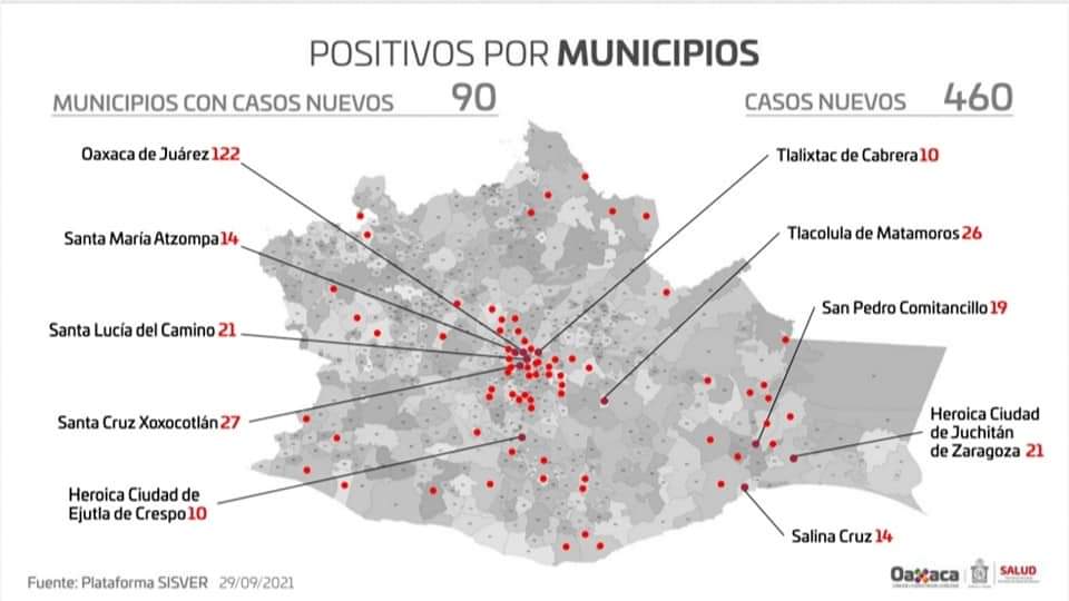 En tanto, Oaxaca de Juárez sobresale de la lista de los ayuntamientos con el mayor número de casos nuevos en esta jornada, al notificar 122 contagios, seguido de Santa Cruz Xoxocotlán con 27, Tlacolula de Matamoros con 26, así como la Heroica Ciudad de Juchitán de Zaragoza y Santa Lucía del Camino con 21 cada uno, principalmente.