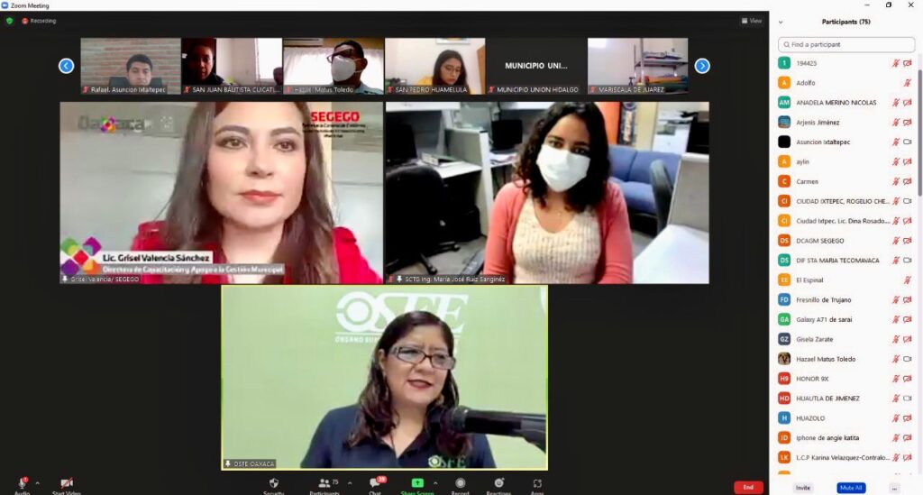 La capacitación que inició el pasado 7 de octubre a través de la plataforma digital zoom, fue inaugurada por Arabella Hernández García, en representación de la Secretaría de la Contraloría y Transparencia Gubernamental y contó con la ponencia a cargo de la jefa del departamento de Capacitación a Municipios de la secretaría de la Contraloría y Transparencia Gubernamental, María José Ruiz Sanguinez.