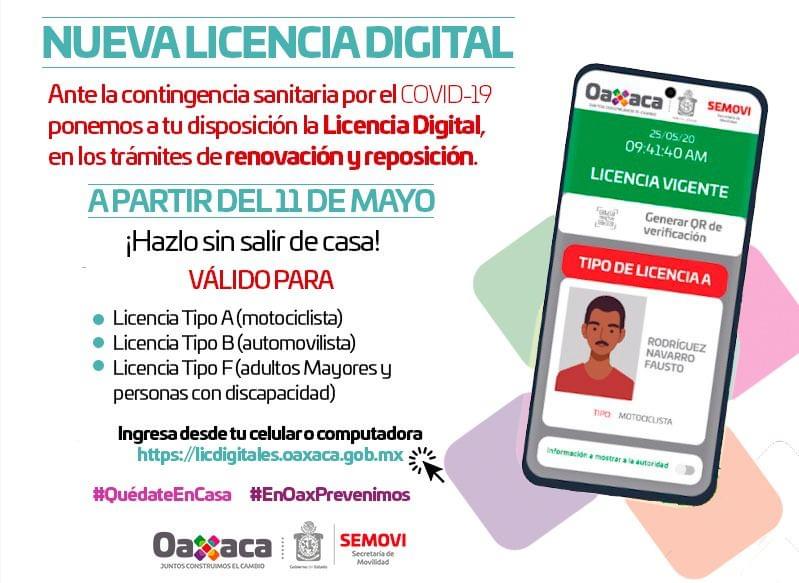 Oaxaca de Juárez, Oax. 11 de mayo. Ante la contingencia sanitaria por el COVID-19, la Secretaría de Movilidad (Semovi) iniciará este lunes 11 de mayo el nuevo proceso de reposición y renovación de licencias digitales para conductores del servicio particular tipo A, para motociclistas; tipo B, para automovilistas y tipo F, para usuarios de la tercera edad o discapacidad.