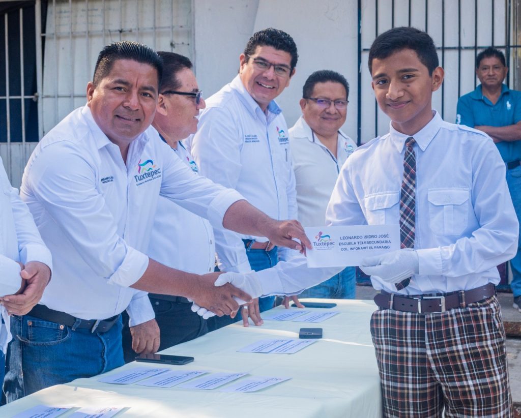 Tuxtepec, Oaxaca .- “En esta Administración hacemos un esfuerzo adicional para mejorar la infraestructura de las escuelas y vamos a seguir trabajando por la educación, que es la única forma de sacar adelante a Tuxtepec, pero eso lo tenemos que hacer todos, maestros, padres de familia y gobierno, para poder seguir creciendo juntos”, afirmó el presidente municipal, Fernando Bautista Dávila, al hacer entrega de apoyos para la Escuela Telesecundaria de la colonia El Paraíso e incentivos económicos a 20 estudiantes de este plantel educativo.