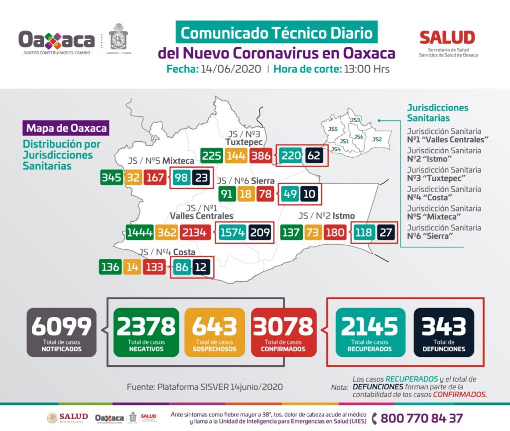 Oaxaca de Juárez, Oax. 14 de junio de 2020.- Los casos confirmados de COVID-19 en Oaxaca alcanzaron este domingo los tres mil 078 pacientes, 140 más que día de ayer, indicó el secretario de Salud en la entidad, Donato Casas Escamilla, al dar a conocer el informe diario epidemiológico de la pandemia.