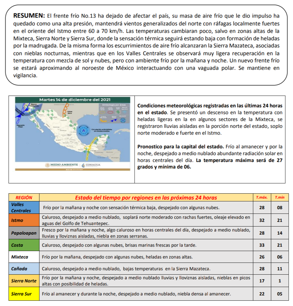 Oaxaca de Juárez, Oax., 14 de diciembre de 2021.- La Coordinación Estatal de Protección Civil de Oaxaca (CEPCO), informa que el frente frío número 13 ha dejado de afectar el país, su masa de aire frío que le dio impulso ha quedado como una alta presión, y mantendrá vientos generalizados del norte con ráfagas localmente fuertes en el oriente del Istmo entre 60 a 70 kilómetros por hora.