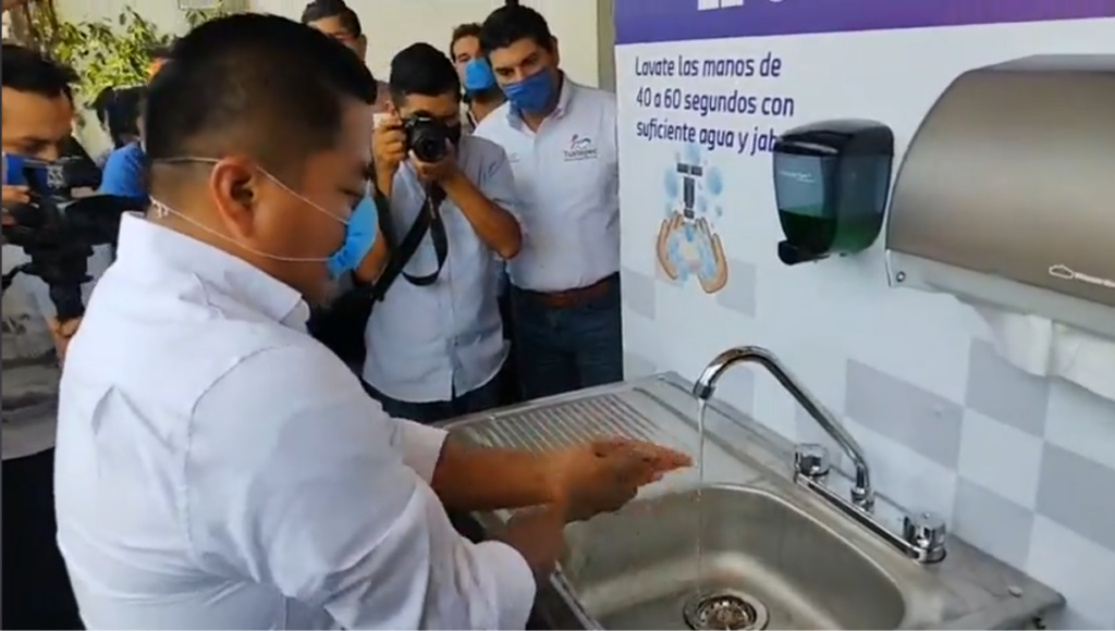 El alcalde, que estuvo acompañado del jefe del área de epidemiología de la Jurisdicción Sanitaria 03, Iván Cruz Cruz, del Jefe de Salud Municipal, Abel Jiménez Gómez, así como de integrantes del Cabildo, expuso que el objetivo de instalar este módulo de sanitización en la Central de Autobuses es evitar que las personas que tienen que viajar por alguna necesidad y que llegan a esta terminal, tengan un lugar en donde poder lavarse las manos, ponerse gel antibacterial y puedan obtener información necesaria sobre el Coronavirus, pero principalmente para que los que van a viajar o llegan a esta ciudad en las diferentes líneas de autobuses no se conviertan en transmisores de esta enfermedad.