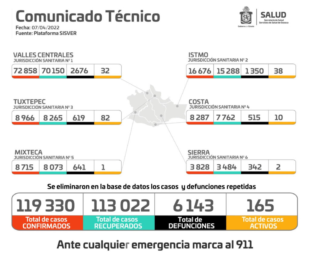 La dependencia informó que actualmente hay 165 pacientes activos ubicados en 25 municipios, 113 mil 022 personas recuperadas, y en esta jornada se agregó un caso nuevo en Abejones y uno más en San Dionisio del Mar, así también se notificó una defunción en la Jurisdicción Sanitaria de la Costa.
