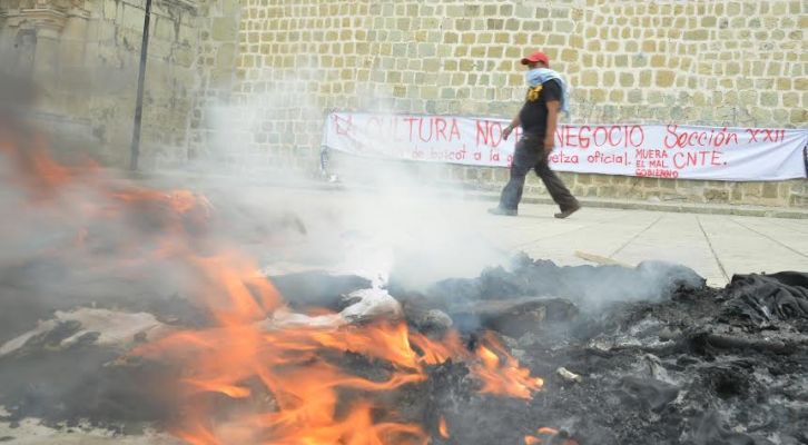 Antes de comenzar su mitin político, los profesores quemaron la lona y colgaron otra en donde escribieron: “La cultura no es negocio”, “Primera acción de boicot a la Guelaguetza oficial, muera el mal gobierno”.