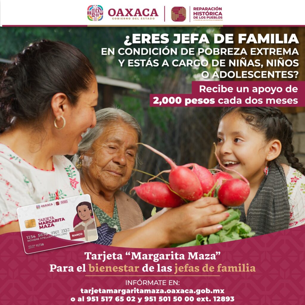 Para conocer mayores informes, la Sebienti pone a disposición los siguientes teléfonos: 951 517 65 02 y 951 501 50 00 Extensión 12893, o bien visitar la página oficial https://www.oaxaca.gob.mx/sebienti/tarjeta-margarita-maza/.